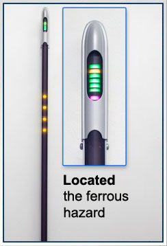 questo metaldetector può rilevare oggetti ferromagnetici piccoli come un ago. Il metaldetector utilizza gruppi di led per indicare a quale altezza si trova l'oggetto rilevato e facilitarne l'estrazione Utilizza la tecnologia del "campo vicino" quindi non risente dell'umidità e non emette radiazioni elettromagnetiche
